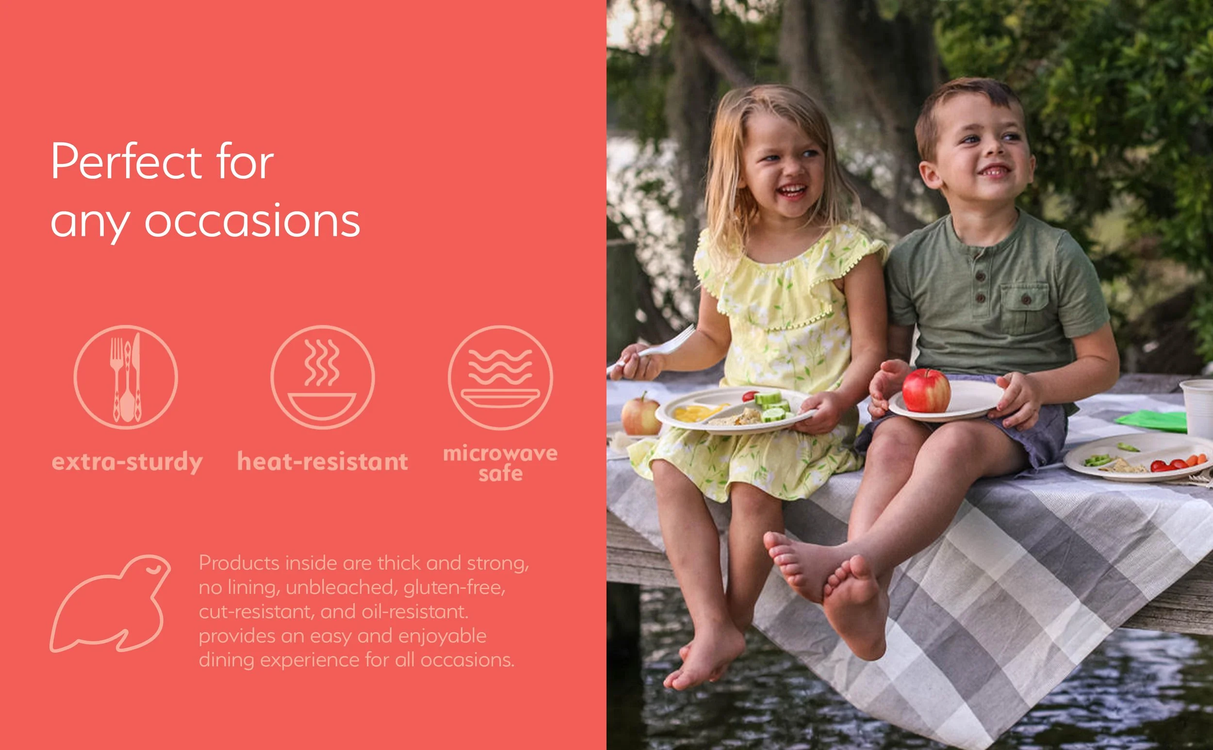 MATERIAL: Made from sustainable & renewable plant-starch and plant-fiber, including bamboo fiber and sugarcane fiber (bagasse). Products inside are thick and strong, no lining, unbleached, gluten-free, cut-resistant, and oil-resistant.