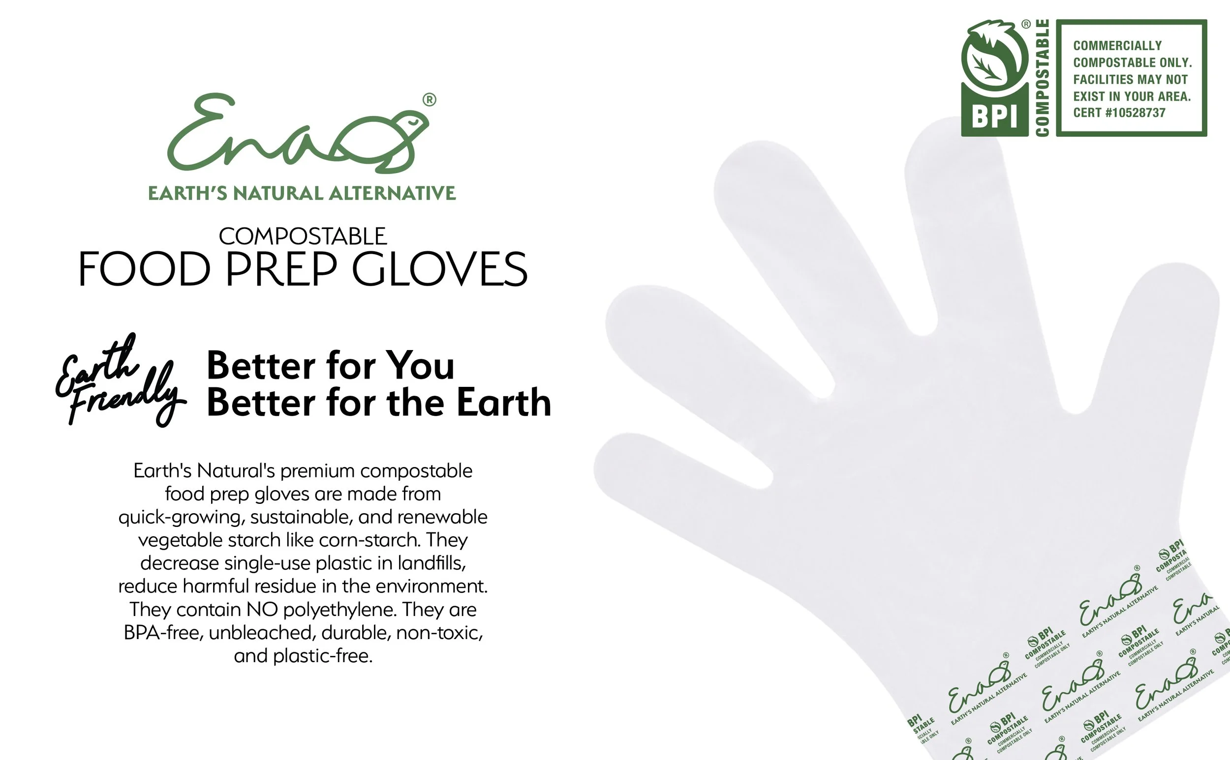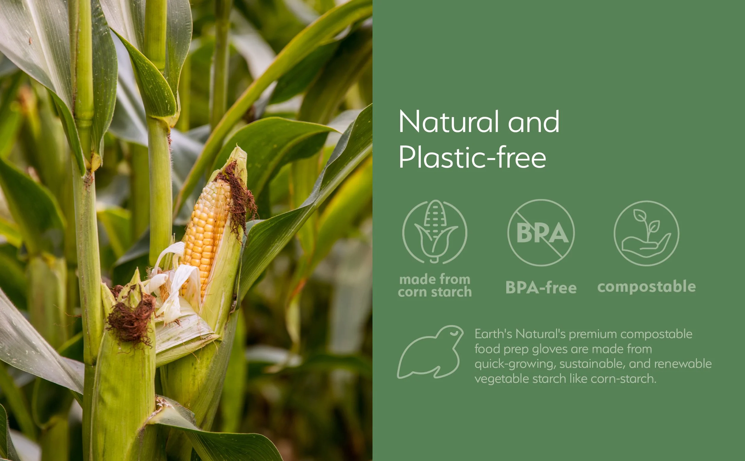 MATERIAL: Earth Natural's premium compostable cleaning gloves are made from quick-growing, sustainable, and renewable vegetable starch like corn starch. Our food gloves are unbleached, durable, non-toxic, BPA-free, and plastic-free.