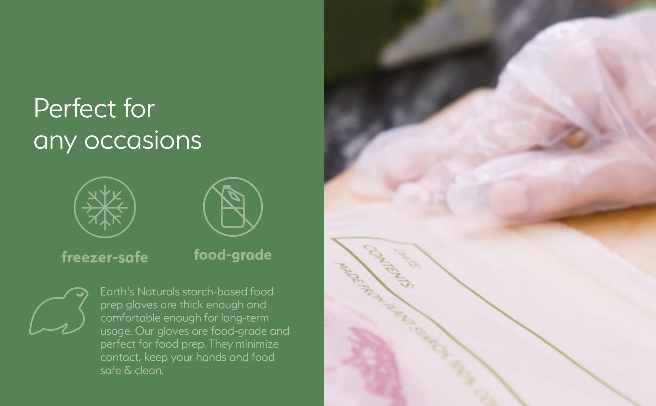 OCCASION: Earth's Naturals starch-based food prep gloves are thick enough and comfortable enough for long-term usage. Earths Natural's food service gloves are food-grade and perfect for food prep. They minimize contact, keep your hands and food safe & clean.