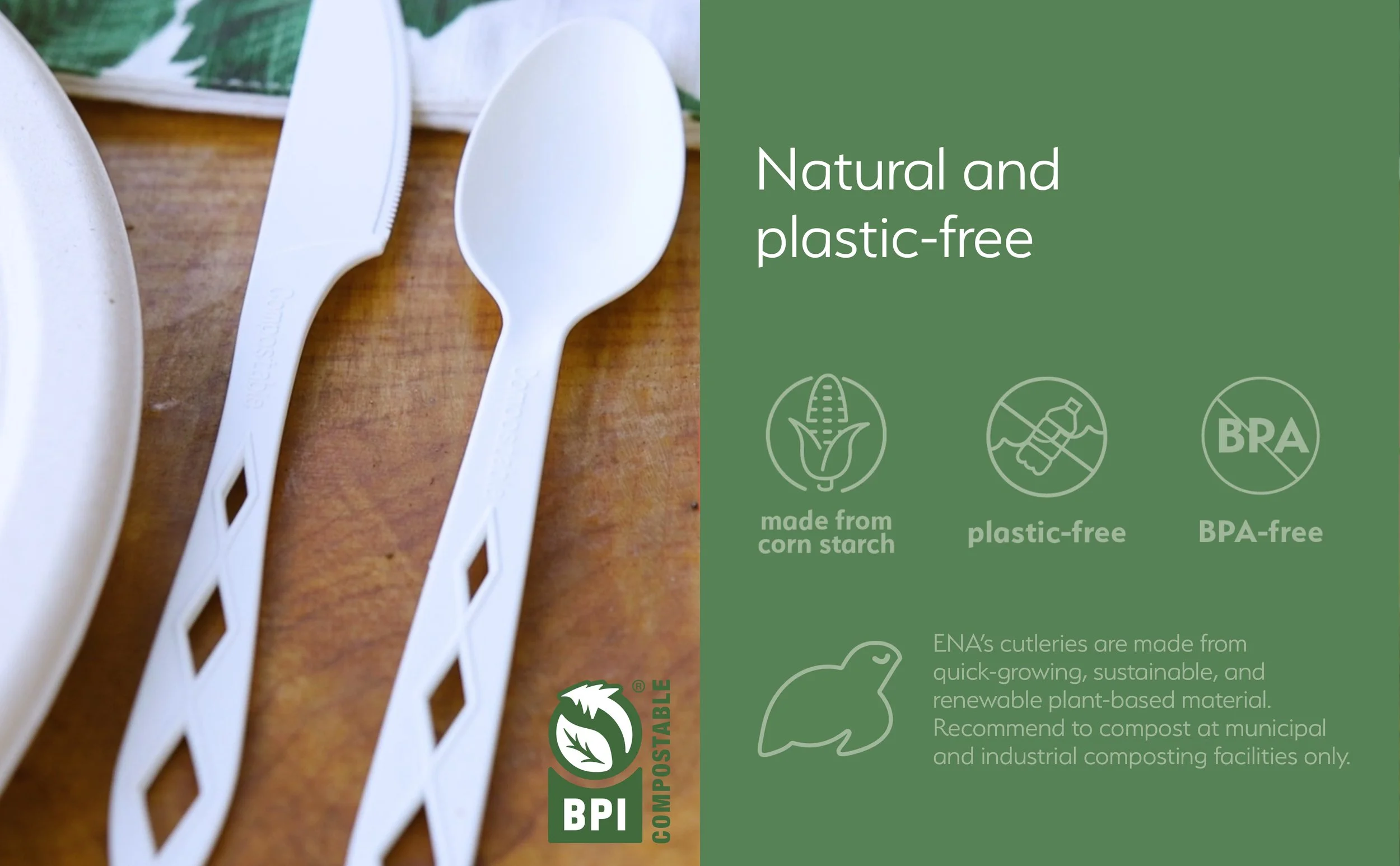MATERIAL: Earth Natural's premium compostable nonplastic silverware set is made from CPLA (Crystallized Poly Lactic Acid), a heat resistant environmentally-friendly alternative to plastics, made from quick-growing, sustainable, and renewable vegetable starch such as corn starch.