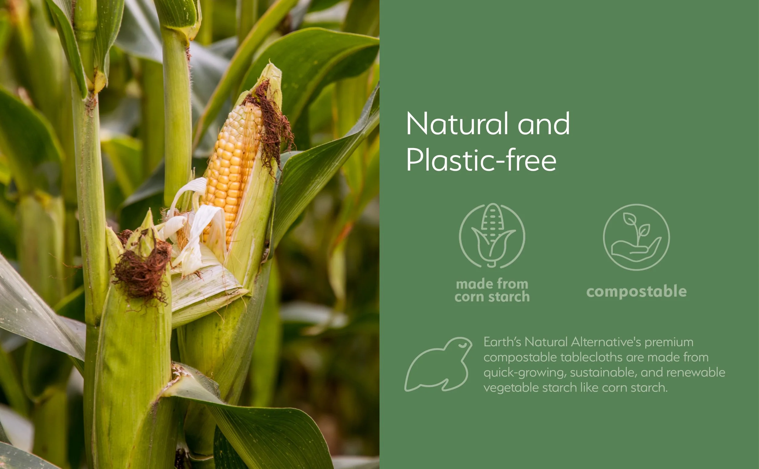 MATERIALS: Earth's Natural's premium compostable outdoor patio tablecloths are made from quick-growing, sustainable, and renewable vegetable starch like corn-starch. They contain NO polyethylene. They are water-proofed, BPA-free, unbleached, durable, non-toxic, and plastic-free. They are packaged in compostable bags to decrease plastic waste.